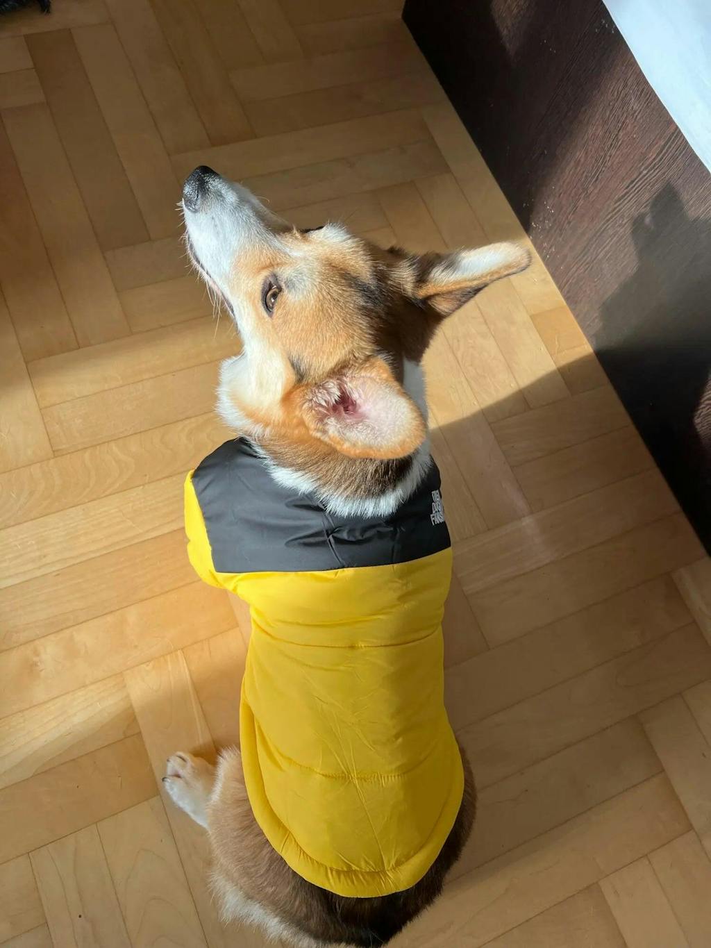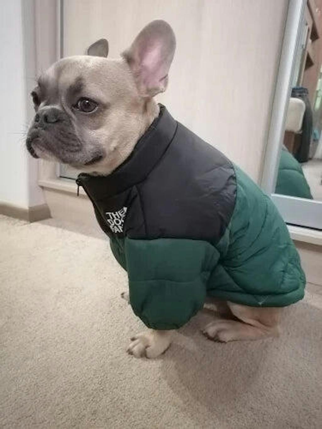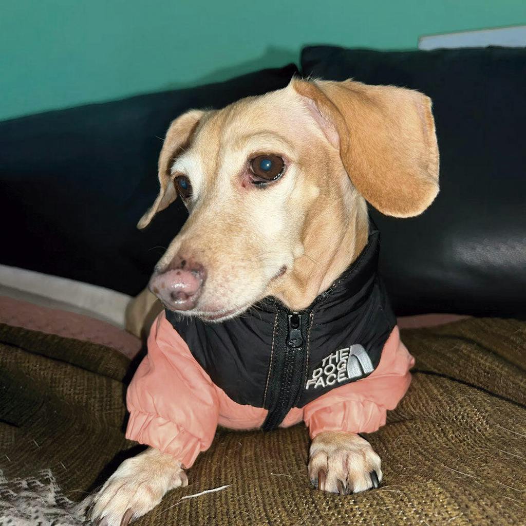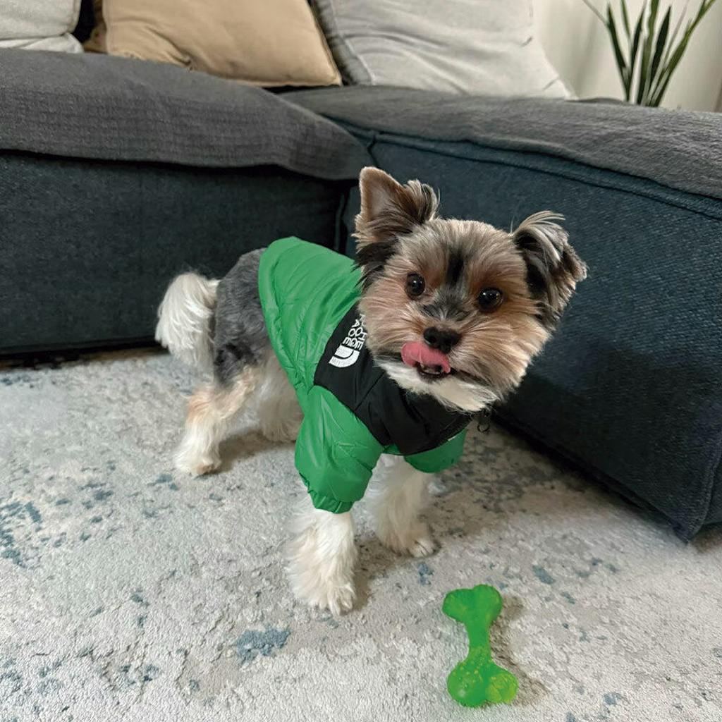 The Dog Face Puffer Jacket is made from high-quality, weatherproof materials designed to keep your dog warm and comfortable during cold weather.