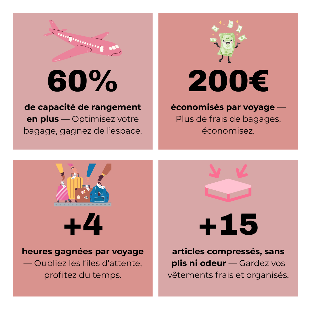 Maximize your packing capacity and save more on every trip! With 60% more space, reduce luggage fees, save hours at the airport, and keep your clothes wrinkle-free and fresh. Travel smarter and enjoy every moment.