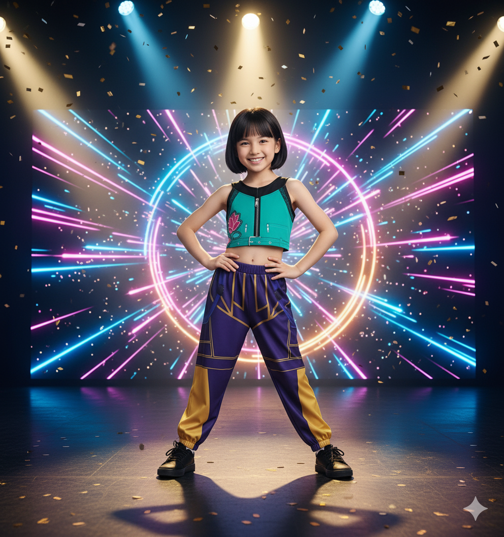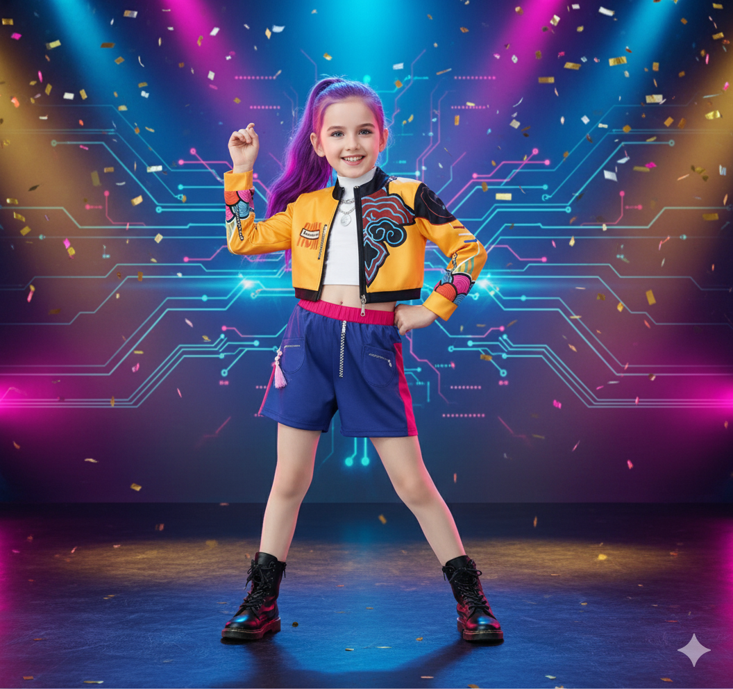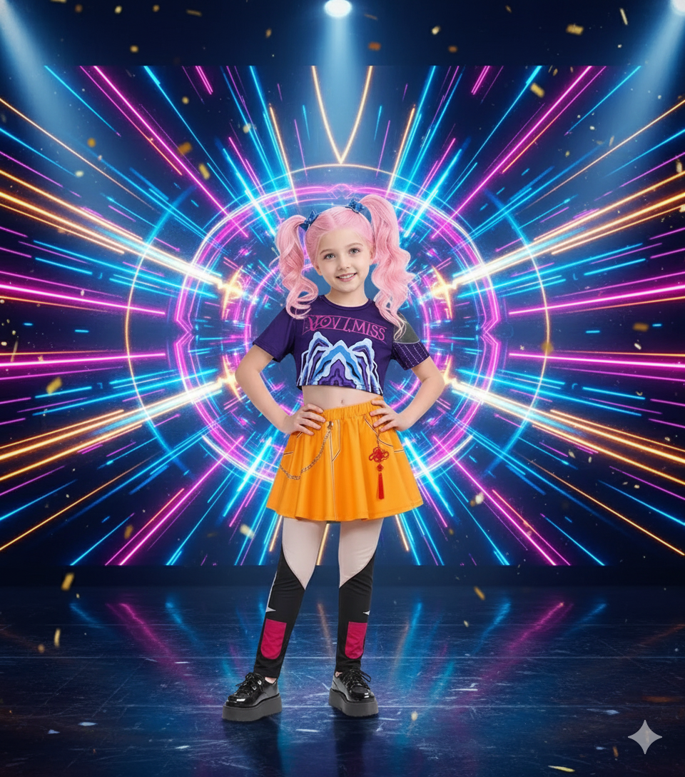 It’s a stylish, idol-inspired costume that lets kids step into the spotlight! Designed with bold colors, trendy details, and stage-ready energy — perfect for every little performer.