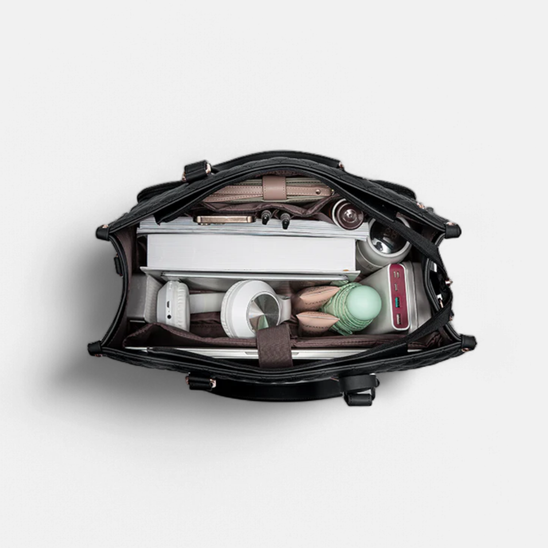 Noa Secret™ blends elegant design with unexpected functionality: it carries your laptop, lunch, and life essentials in one chic, organized space. No more switching bags. No more stress.